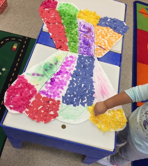 For this activity I do tell my kiddos what to use in each section. You can see that all yellow tissue paper is in one section and blue torn paper is in another, while the purple Do-A-Dot markers are in another area. This is part of following directions. Some of the supplies I have used in the past are: Do-A-Dot markers, paper to tear with fingers, tissue paper squares to crinkle, crayons, markers, sequins, beads, etc.
