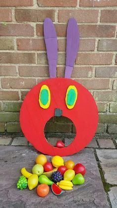 Get those kids moving and practice those gross motor throwing skills with this Very Hungry Caterpillar Toss. Have them practice throwing over hand as well as underhand. Step up the challenge by increasing the distance and talk about why it is harder with a greater distance. Extend this activity into math by counting the fruits that make it in and how many don’t. Compare which number is more and less.